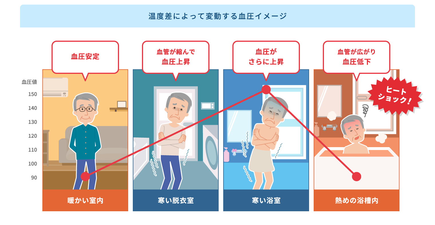 急激な温度変化は血圧が急激に上昇・下降することに繋がり、心臓や脳に大きな負担をかけてしまうことがあります。冬場の入浴は暖かい室内から寒い脱衣室・浴室、熱いお湯が張られた浴槽など急激な温度変化を伴いやすく、入浴中に亡くなられる方の大きな要因の1つはヒートショックといわれています。
