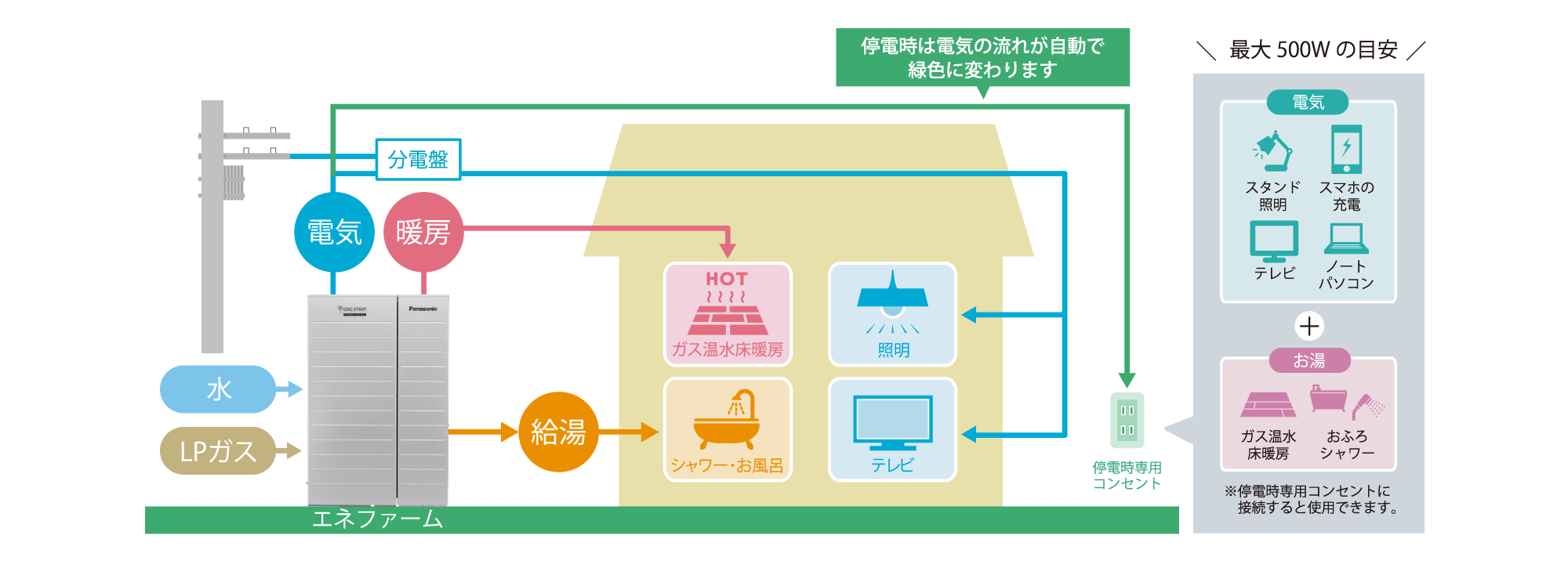 万が一の停電時もエネファームが発電するので明かりの確保やテレビやスマホなどの情報を得るための通信機器の利用も心配ありません。